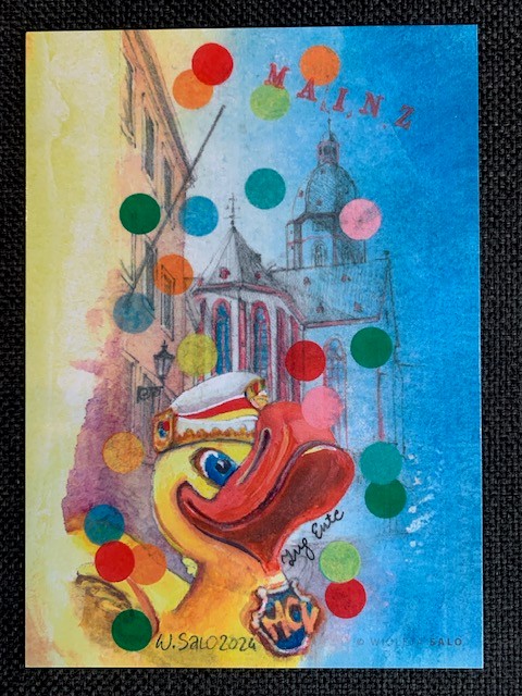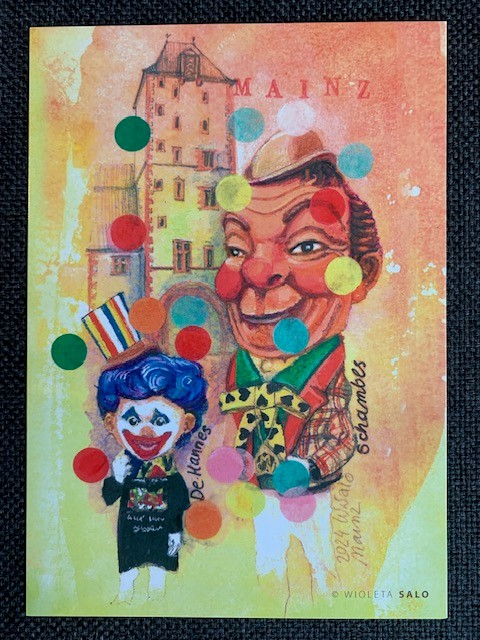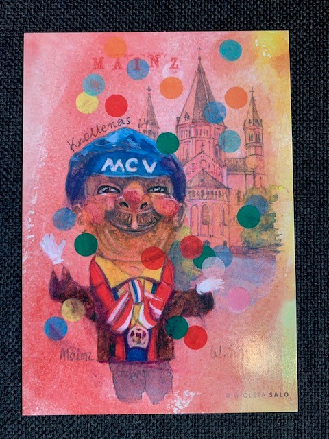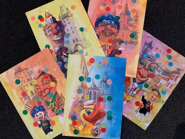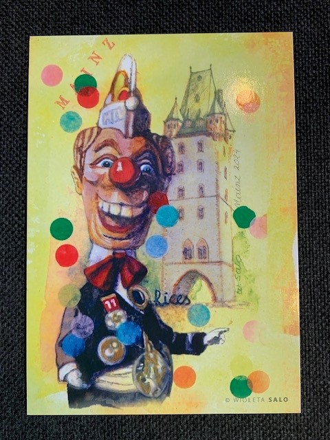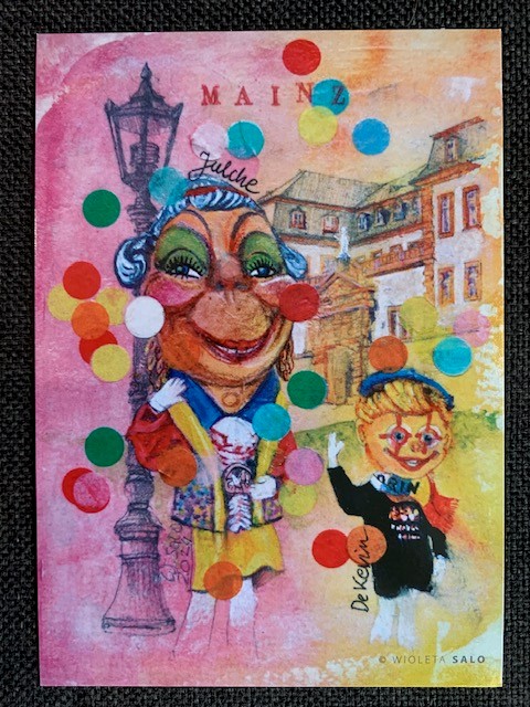 Wioleta Salo – eine Mainzer Künstlerin mit unverwechselbarem Stil – hat diese wunderbaren Motive rund um Figuren der Mainzer Fastnacht geschaffen. Im Package sind fünf Postkarten mit dem Rickes, der Knollenas, dem Schambes & Hannes, der Zugente sowie dem Julchen & Kevin enthalten