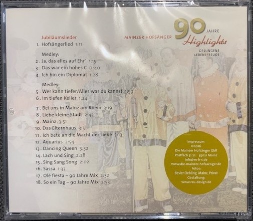 CD 90 Jahre Mainzer Hofsänger: Highlights CD 90 Jahre Mainzer Hofsänger: Highlights 15,00 € inkl. 19 % MwSt. 15 vorrätig CD 90 Jahre Mainzer Hofsänger: Highlights Menge In den Warenkorb Beschreibung Beschreibung Die CD der Mainzer Hofsänger zu ihrem 90. Jubiläum 2016 Ähnliche Produkte LP Margit Sponheimer „Mainz, wie es singt und lacht“ 1988 12,00 € inkl. 19 % MwSt. zzgl. Versandkosten CD Die Mainzer Hofsänger: Zum 100. Jubiläum 15,00 € inkl. 19 % MwSt. zzgl. Versandkosten LP Mainzer Hofsänger „Stimmt an, lasst uns singen“ 1986 12,00 € inkl. 19 % MwSt. zzgl. Versandkosten DVD „Bei uns in Meenz“ 8,50 € inkl. 19 % MwSt. zzgl. Versandkosten