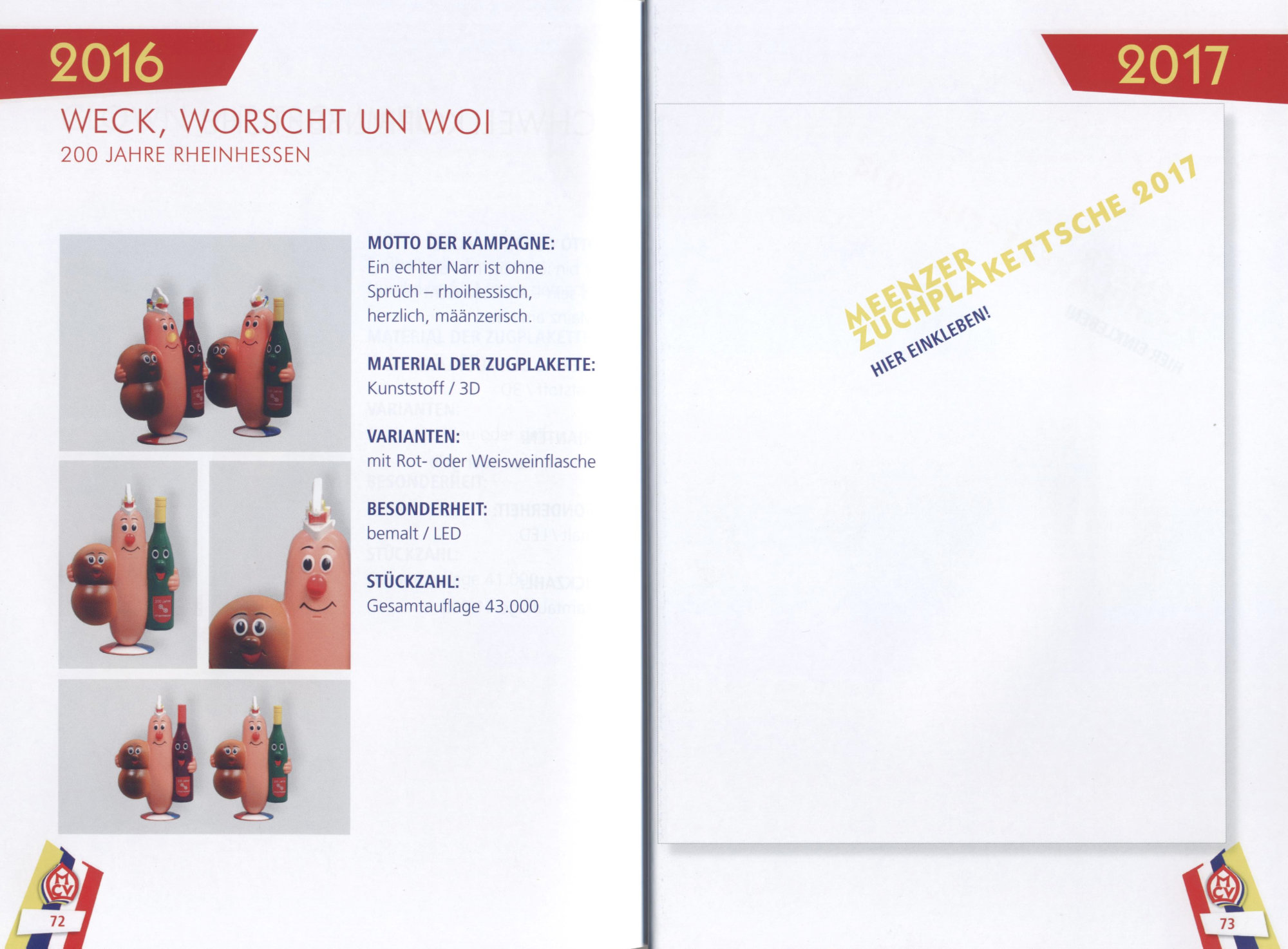 Der ganz besondere Clou: Damit das Mainzer Plakettenbuch nicht schnell veraltet, sind leere Seiten dabei (ab 2017). Jedes Jahr gibt es große Sammelbilder zum Einkleben. Damit schreiben Sie die Geschichte der Mainzer Zugplaketten bequem weiter – bis einschließlich 2025..!