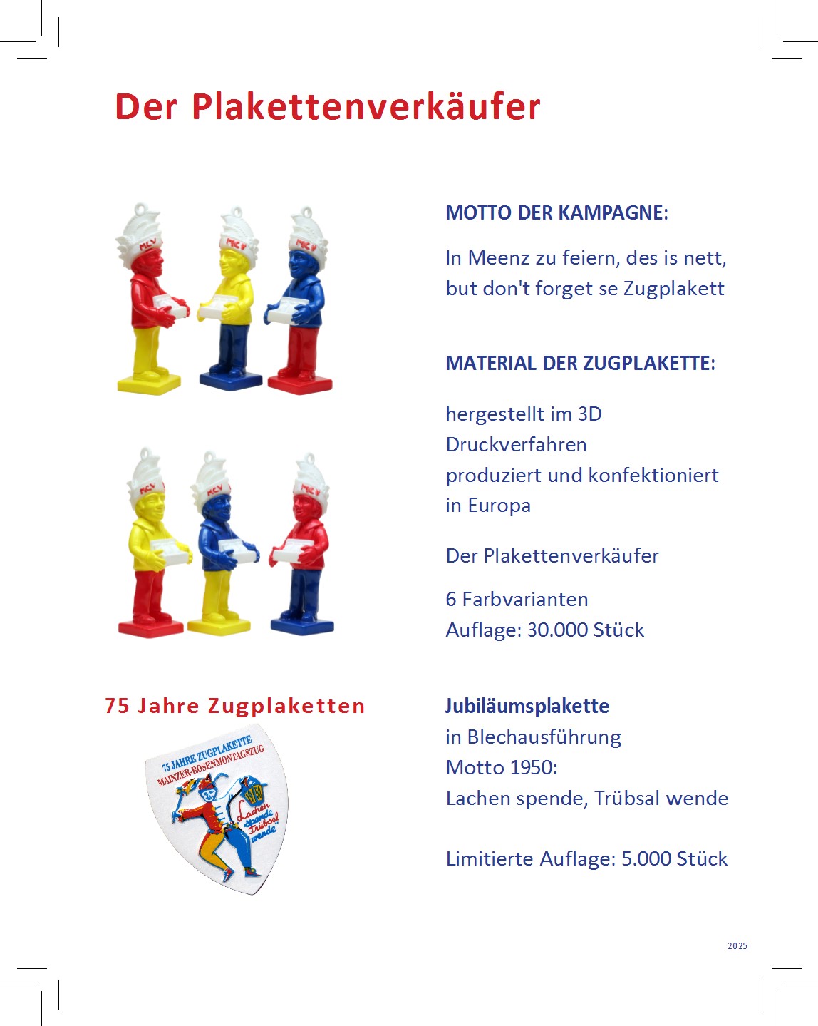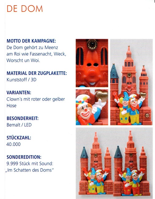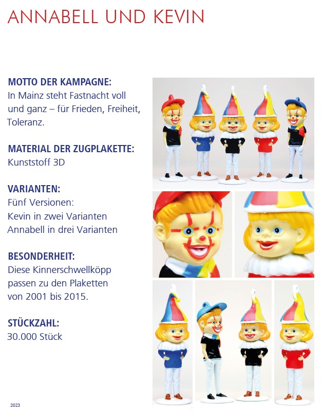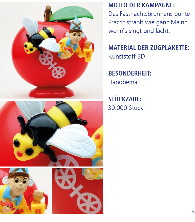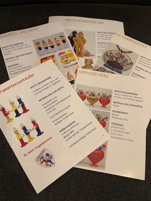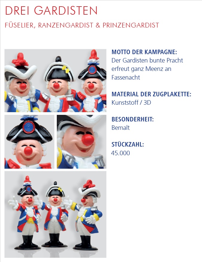 | Jahr | Einkleber 2017 "De Dom", Einkleber 2018 "De Mond", Einkleber 2019 "Drei Gardisten", Einkleber 2020 "Meenzer Herz", Einkleber 2021 "Das Narrenschiff", Einkleber 2022 "Närrische Versuchung", Einkleber 2023 "Annabell und Kevin", Einkleber 2024 "Der Schoppestecher", Einkleber 2025 "Der Plakettenverkäufer" |