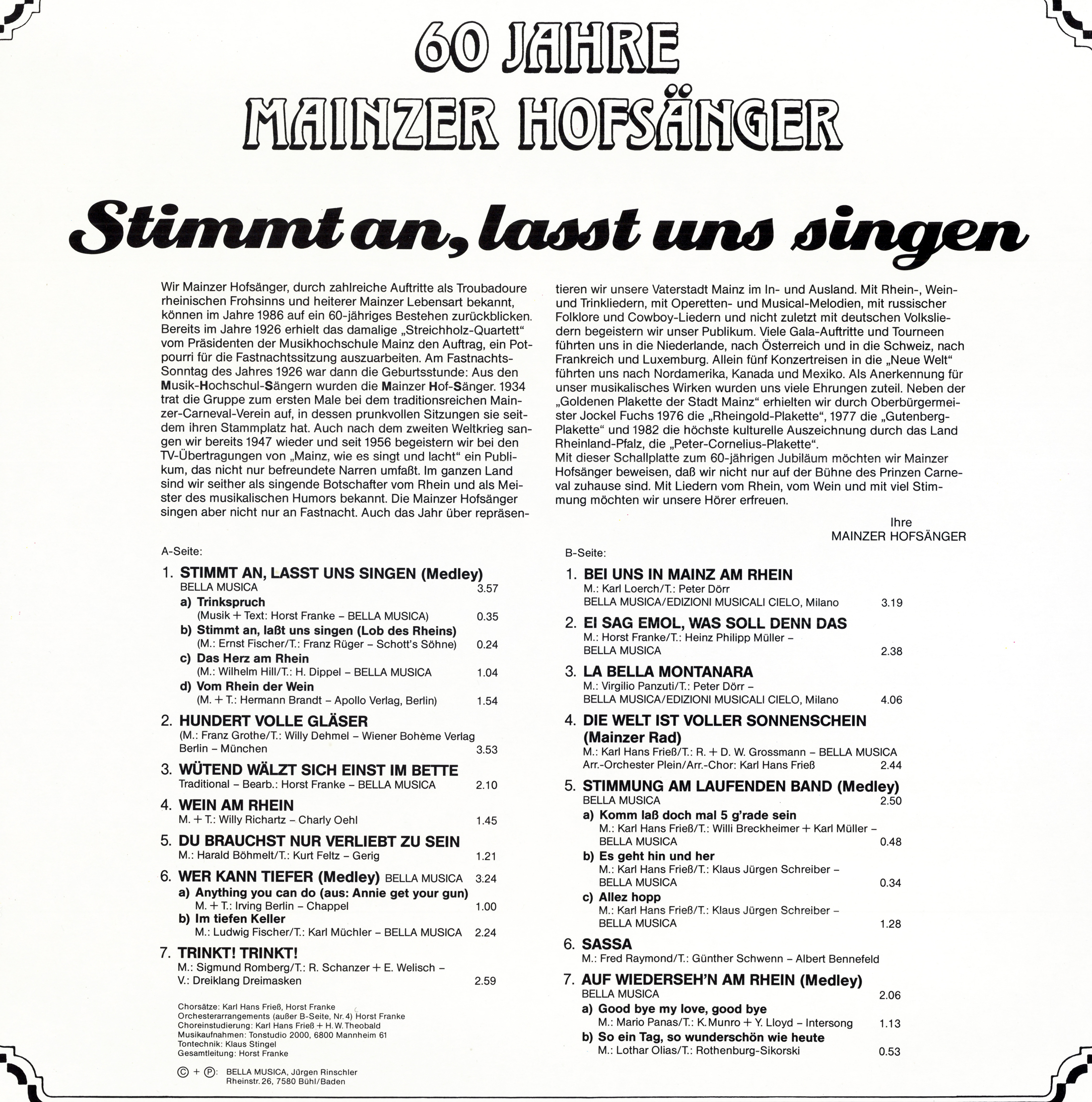1986 feierten Die Mainzer Hofsänger ihr 60. Jubiläum. Zu diesem Anlass wurde damals diese wunderbare Vinyl-Schallplatte herausgegeben. Original eingeschweißt – und somit in „Mint-Qualität“ – kann dieses Schätzchen mit 14 Titeln nun wieder erworben werden, denn ein kleiner Vorrat tauchte unlängst in unserem Archiv wieder auf.