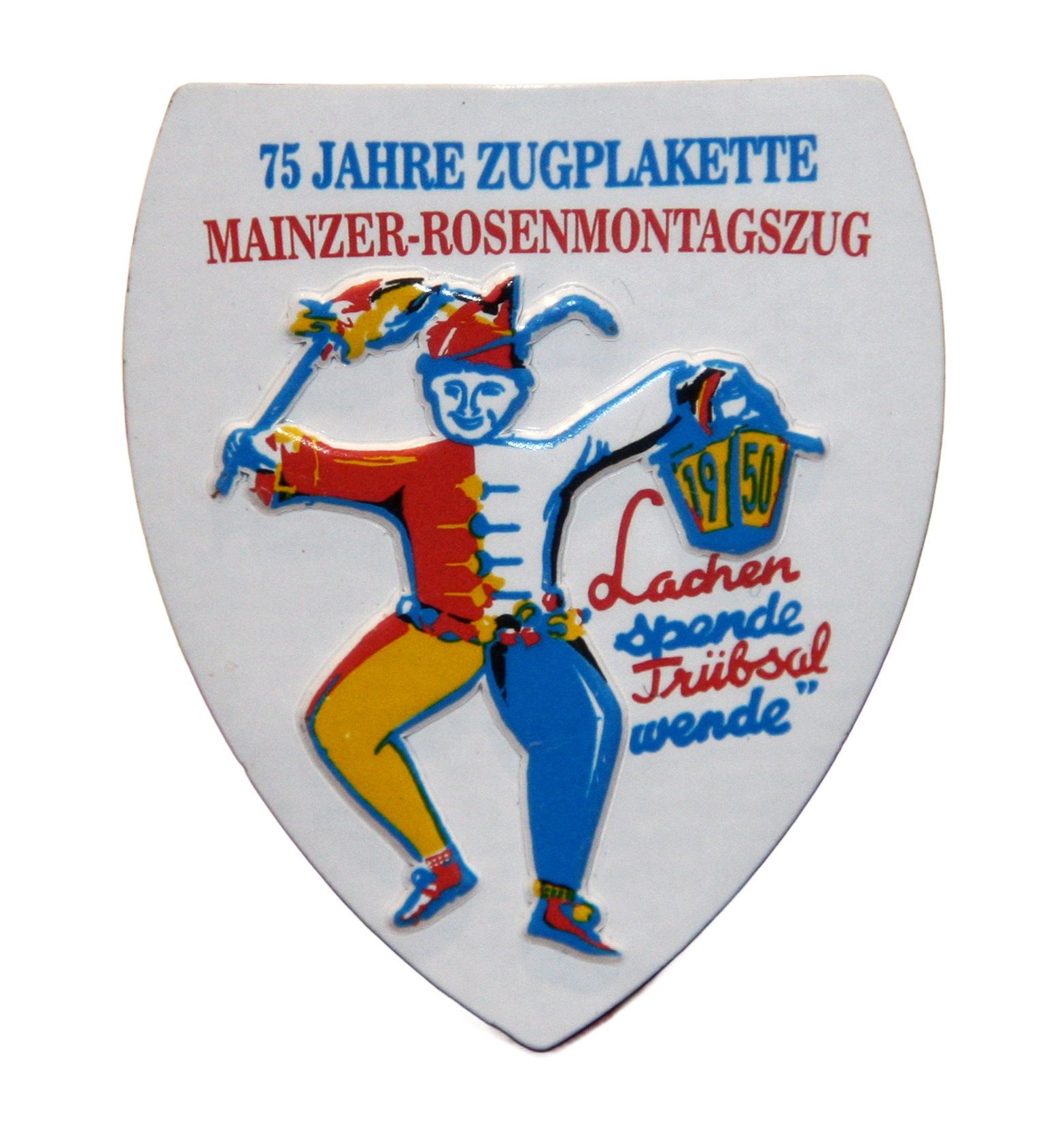 Zum 75. Geburtstag der Zugplakette, die wieder von der Firma BERICAP (ehemals Berg) in Budenheim im Auftrag des MCV produziert wird, präsentiert sich diese Sonderedition als Hommage im nahezu identischen Look von 1950. Das damalige Motto „Lachen spende, Trübsal wende“ scheint aktueller denn je… Wie einst ist auch die Jubiläums-Plakette aus Blech gefertigt, hat jedoch keine Nadel, sondern einen praktischen Pin-Verschluss. Die Neuauflage ist auf 5.000 Exemplare limitiert.