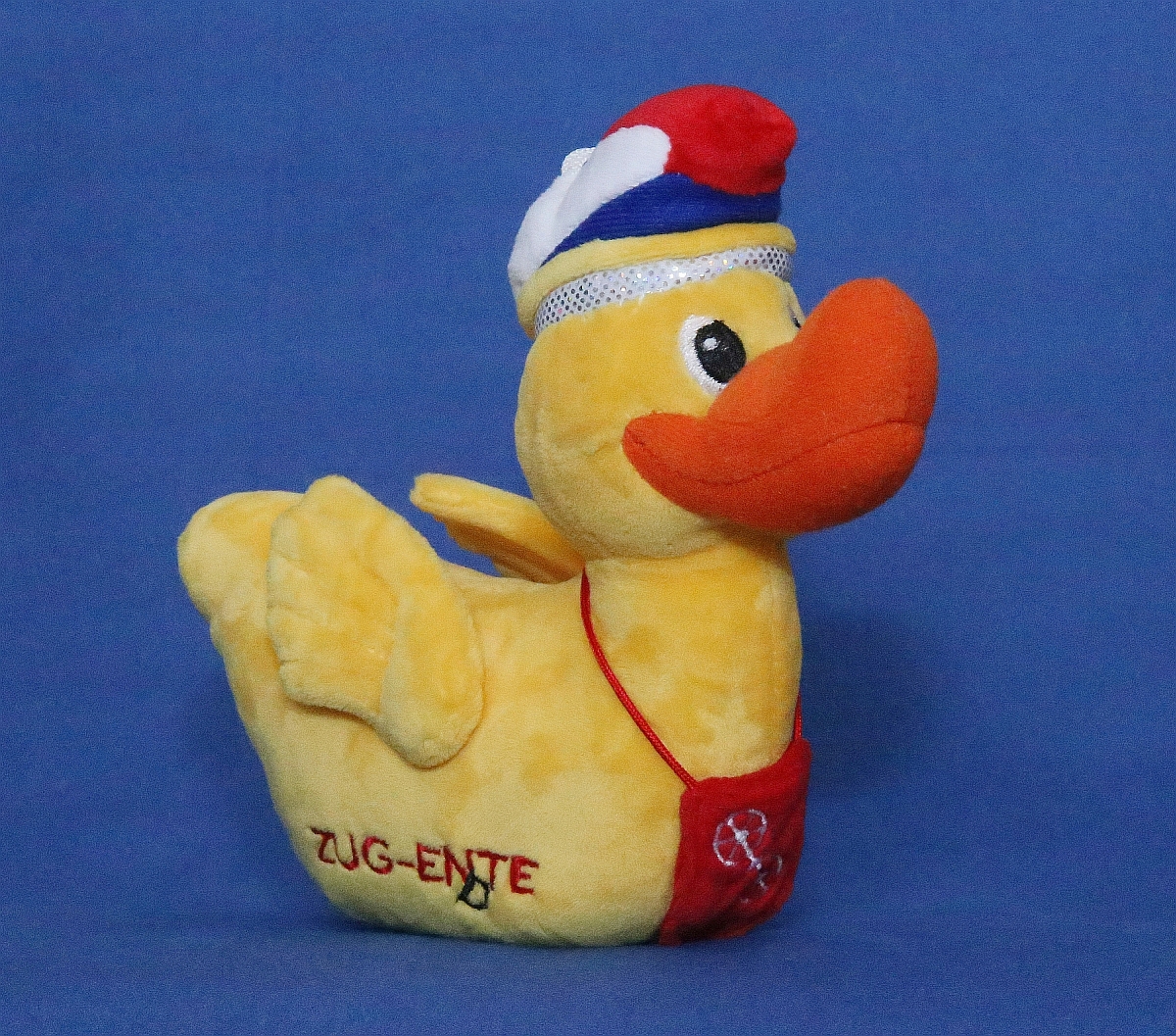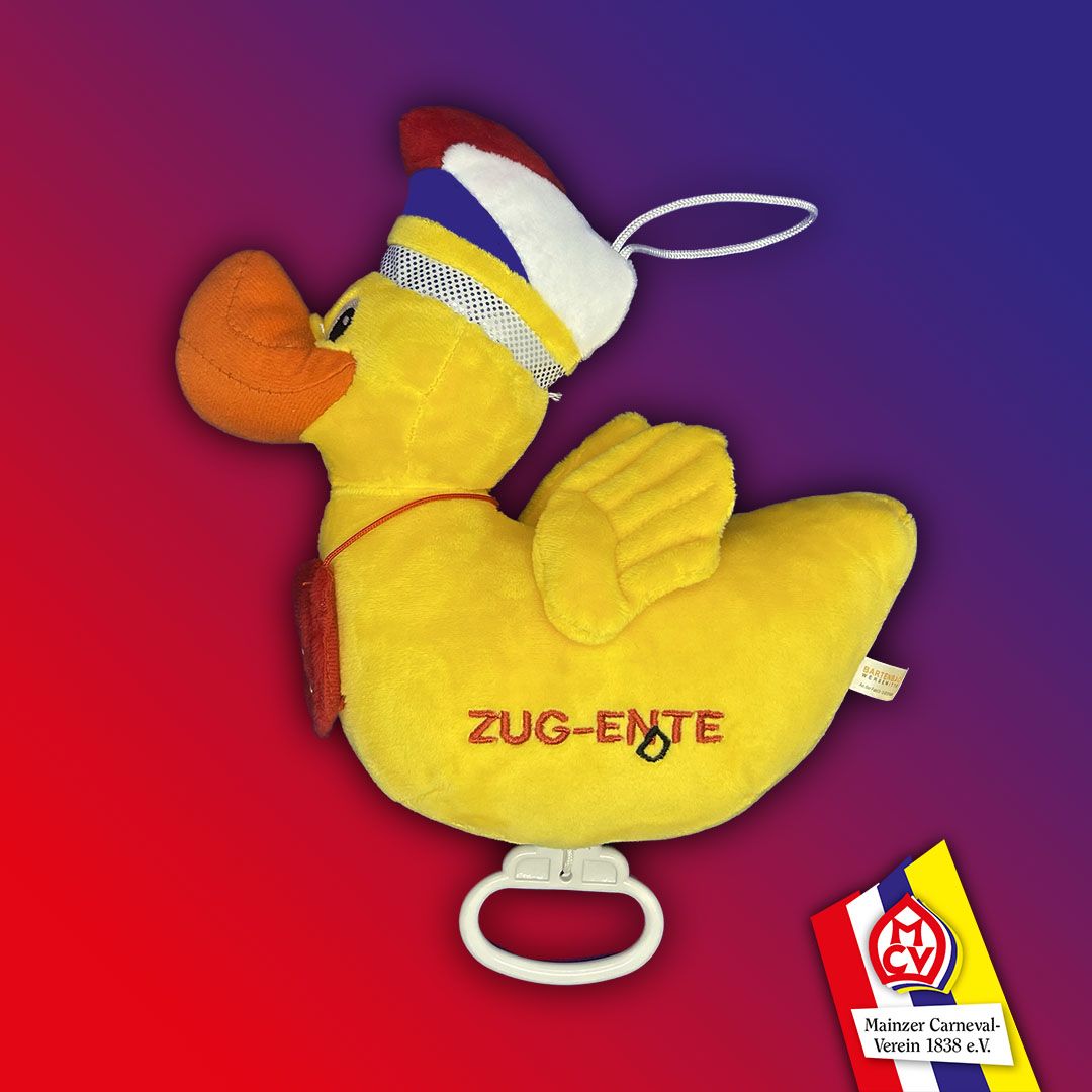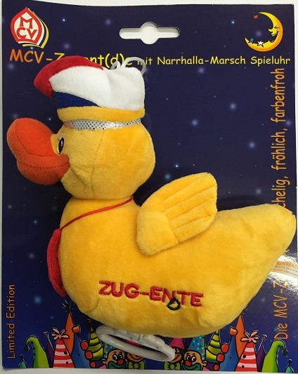 Die Zug-Ente als Kuscheltier. Der Clou: In der Ente verbirgt sich eine echte Spieluhr, die den Narrhallamarsch spielt. Finale 2. Auflage. Kuschel-Ente in den Mainzer Fastnachtsfarben, 20cm hoch und zertifiziert nach EN71.