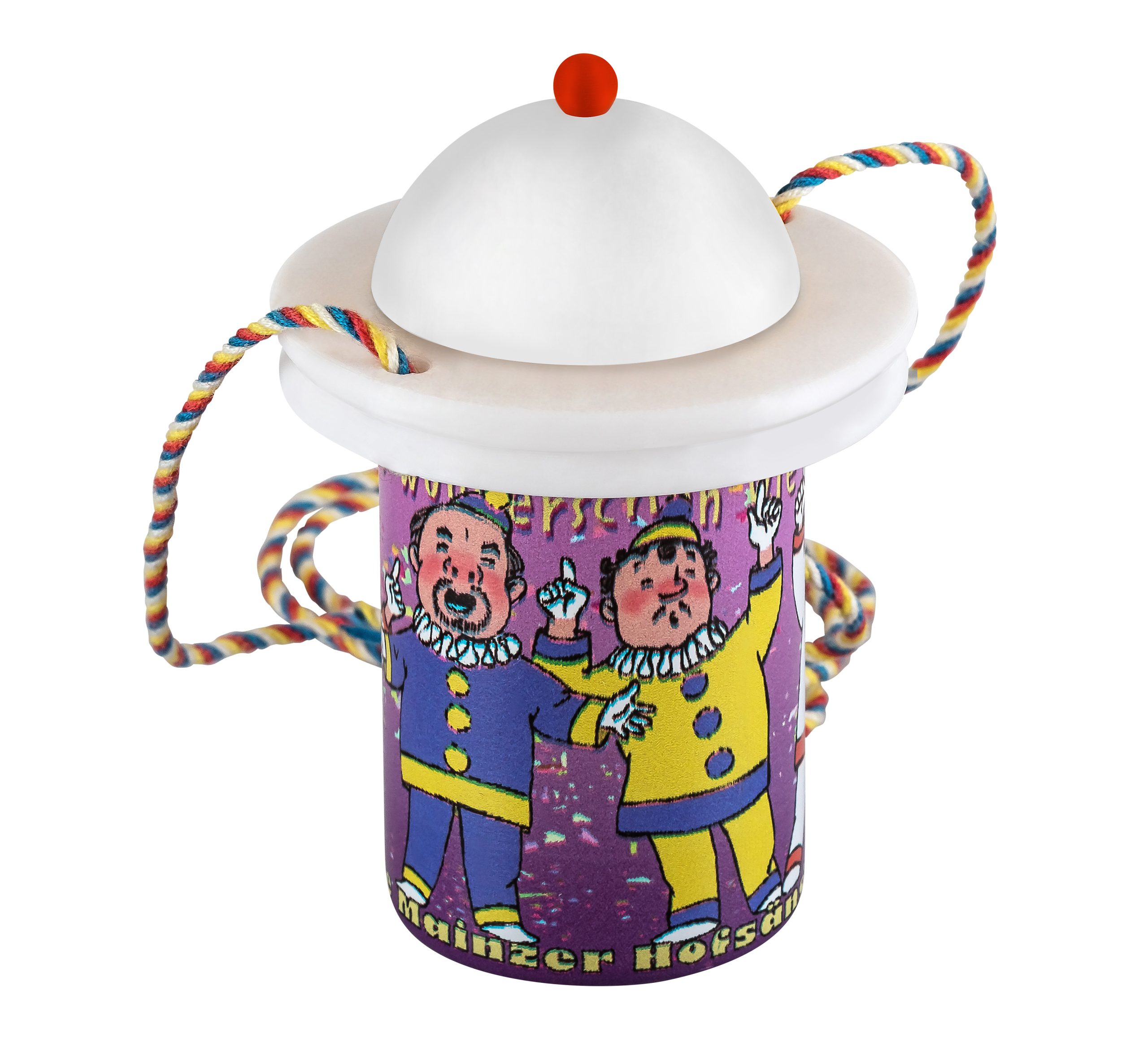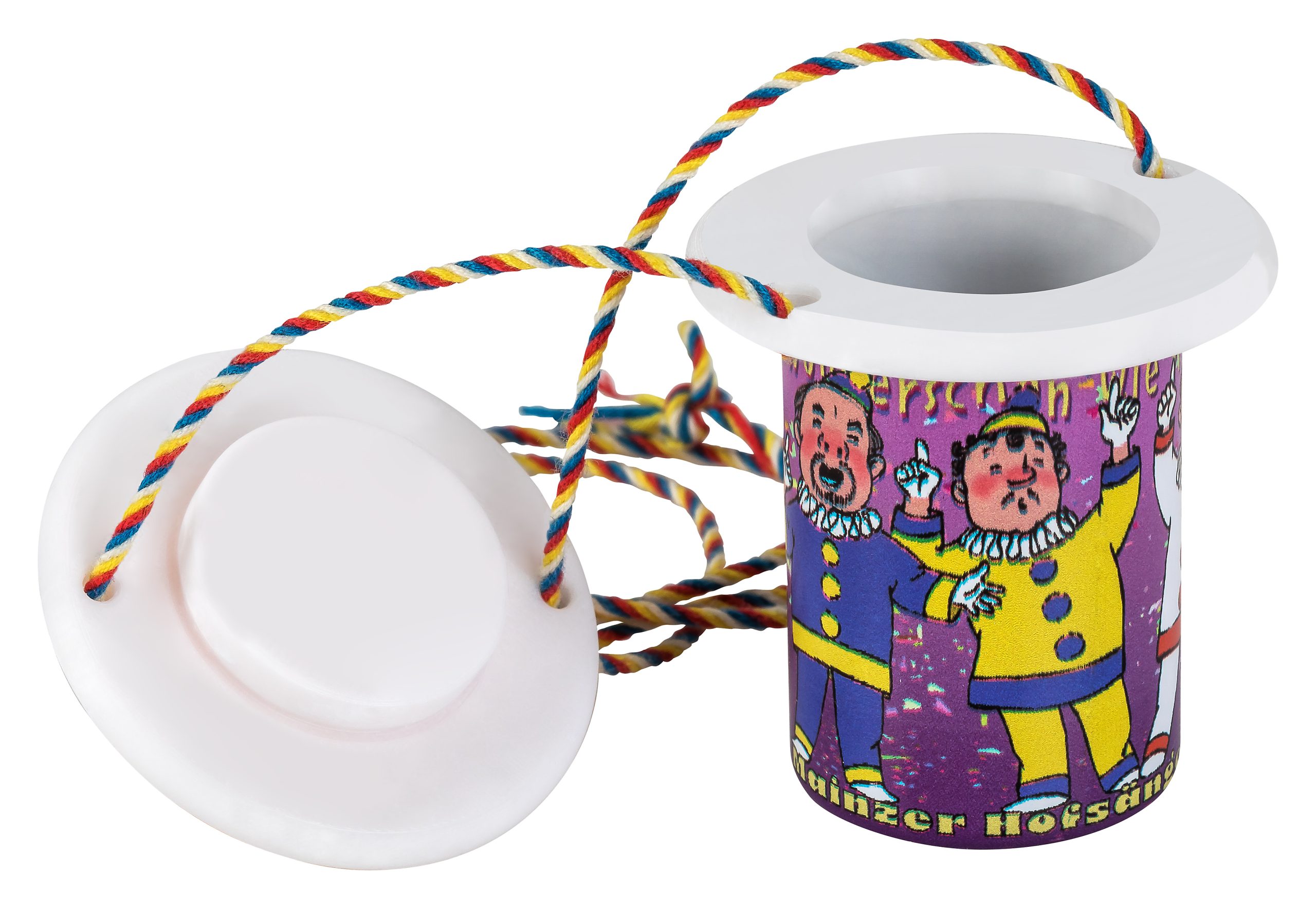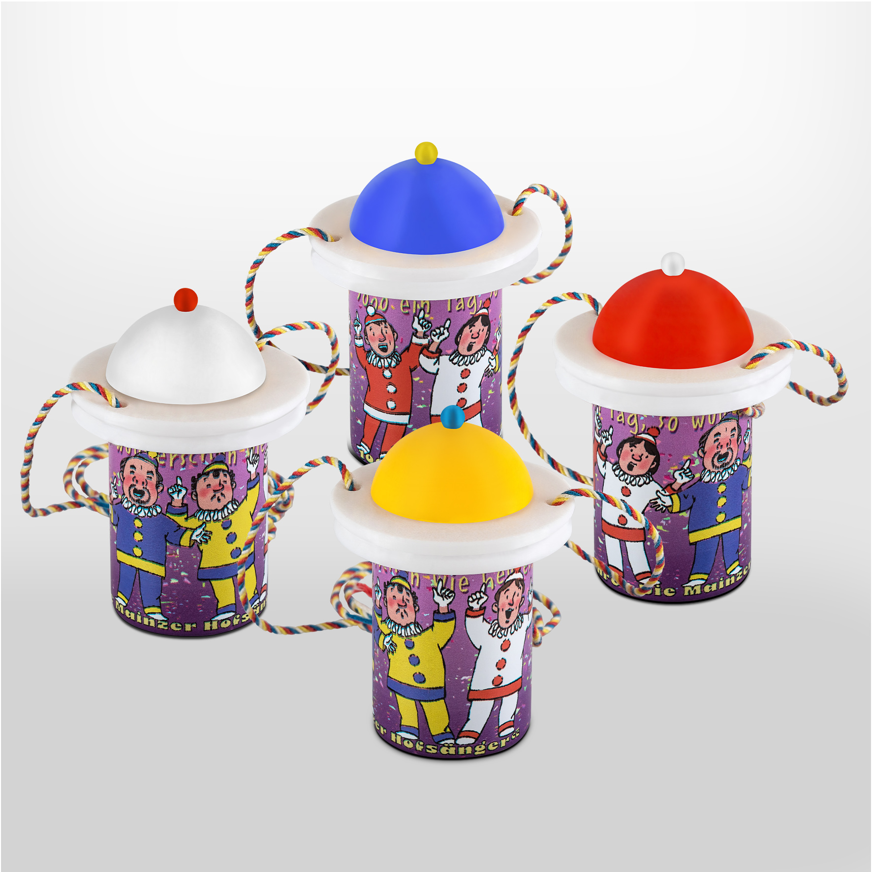Das Zugplakettchen 2026 – „100 Jahre Mainzer Hofsänger“ in Form eines Weiprobiergläschens, mit verschließbarem Deckel und vierfarbbunter Kordel. Erhältlich mit den vier Hut-Varianten, rot, weiß, gelb und blau.