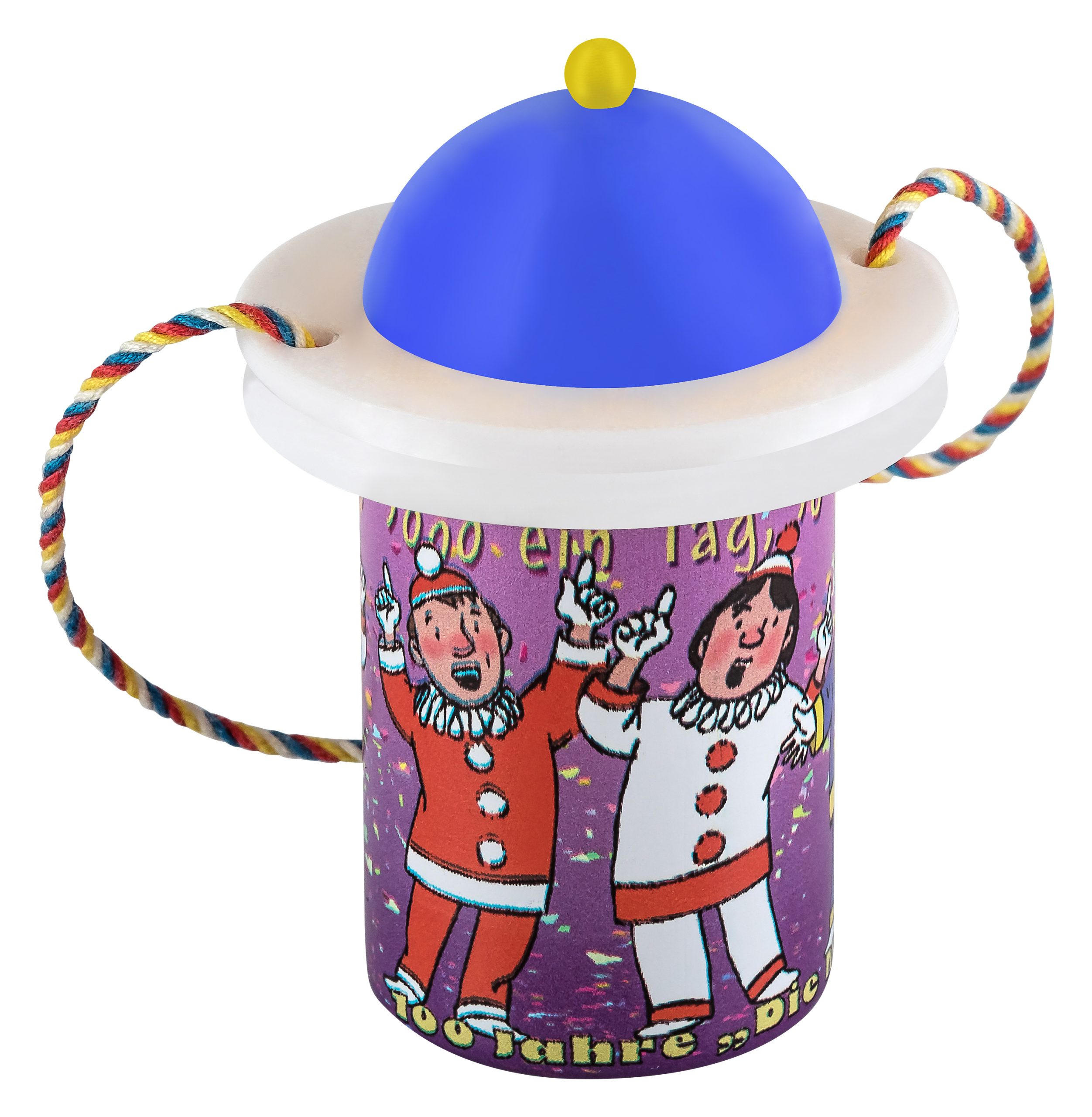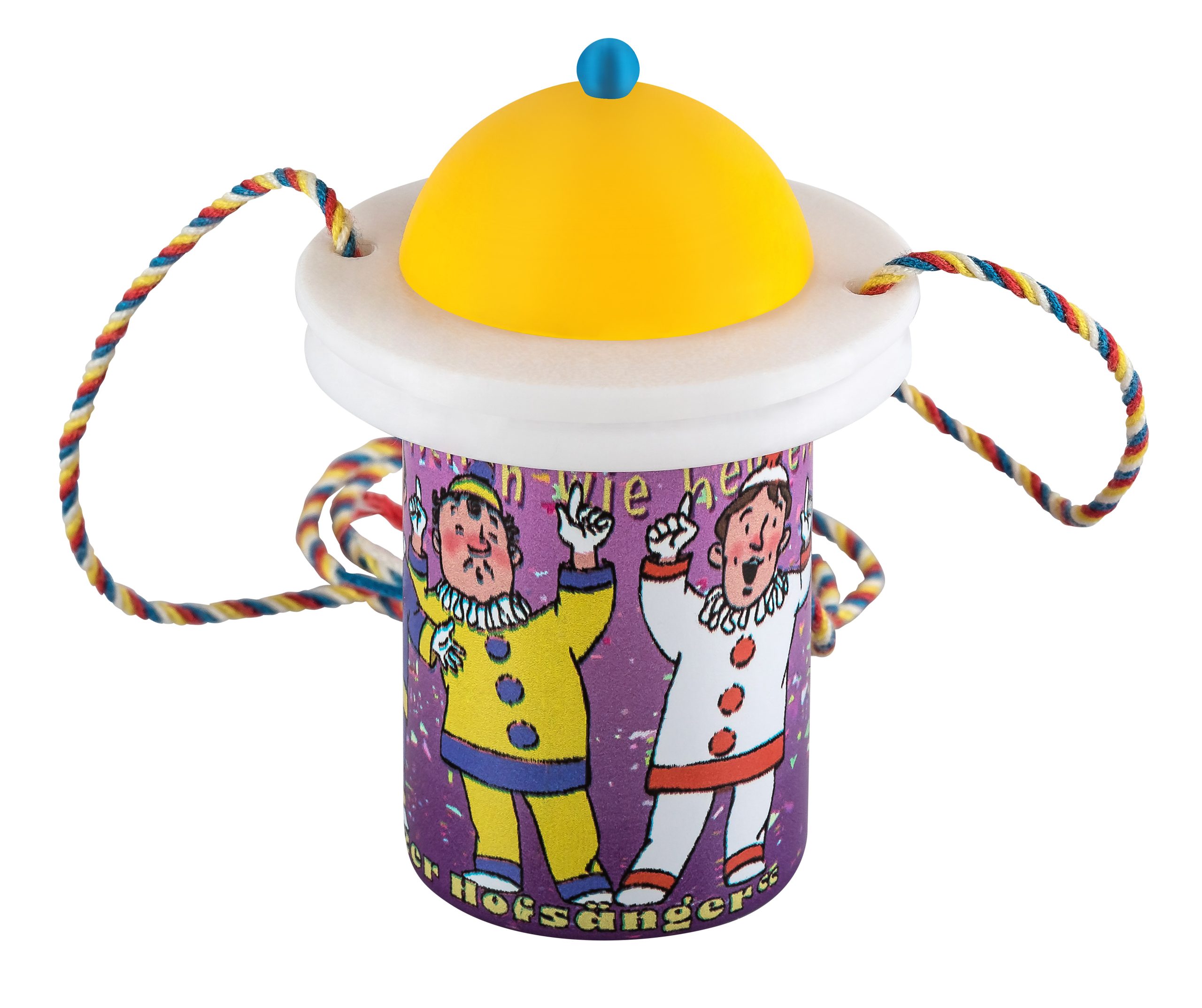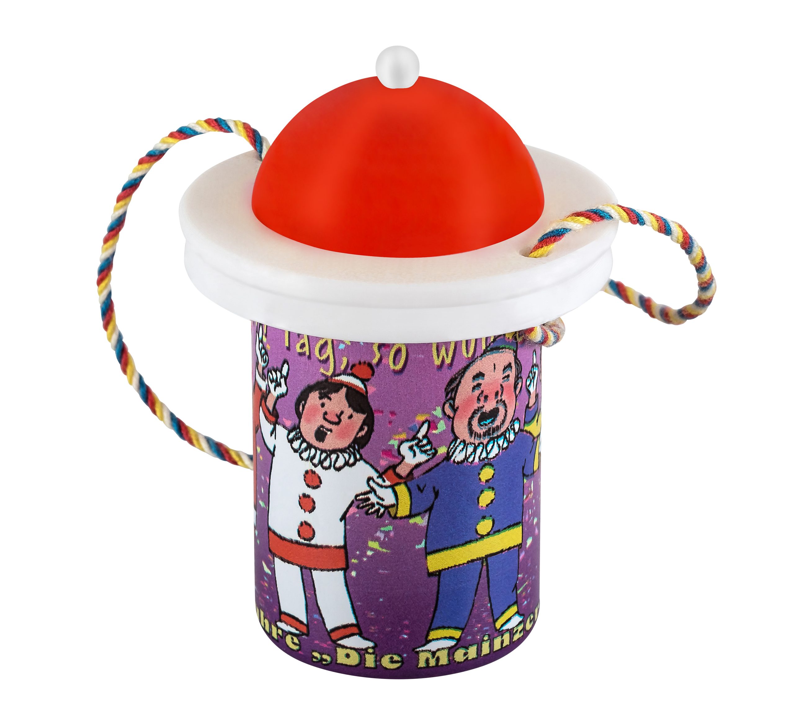 Das Zugplakettchen 2026 – „100 Jahre Mainzer Hofsänger“ in Form eines Weiprobiergläschens, mit verschließbarem Deckel und vierfarbbunter Kordel. Erhältlich mit den vier Hut-Varianten, rot, weiß, gelb und blau.